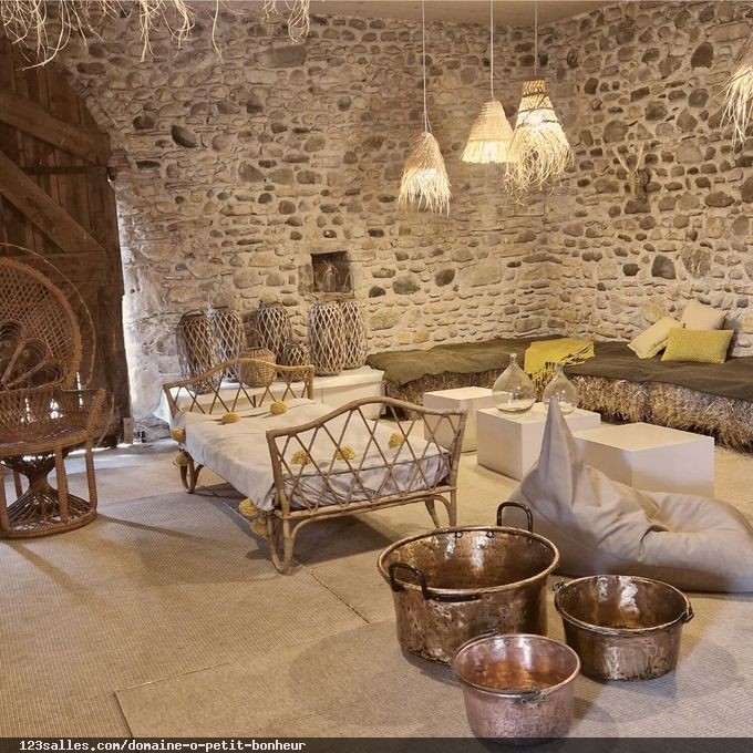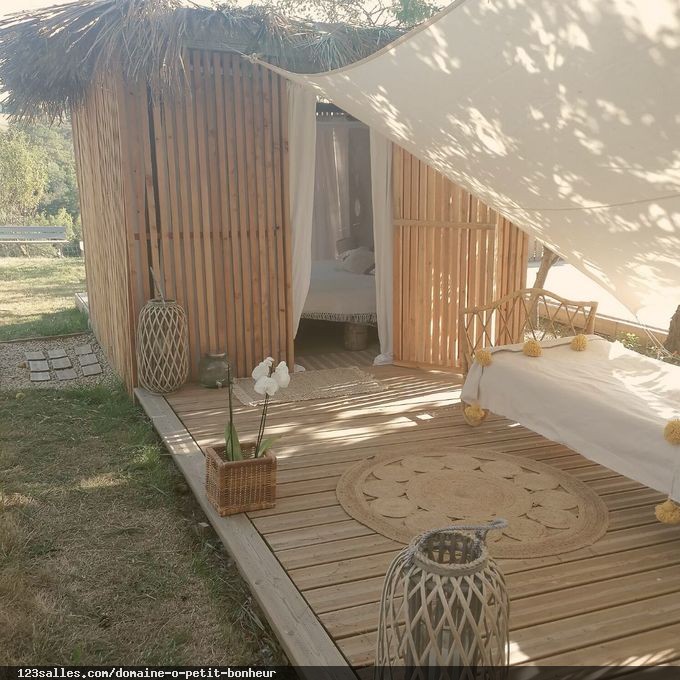 Vous profiterez des terrasses avec espaces lounge, bottes de foin, canapés et d'une décoration bohème chic sur-mesure dans un cadre champêtre habillé de fleurs séchées et de mobilier vintage, sans oublier la piscine de 6 x 12 mètres, pour vous rafraîchir. Nous fournissons beaucoup de mobilier, des voiles imperméables anti UV, facilement démontables.
