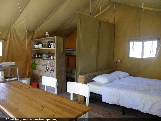 * Deux tentes Safari Lodge sur plancher de bois meublé tout confort avec chambres et vrai lits. Tout équipé (réfrigérateur, réchaud, cafetière, barbecue armoire et vaisselle)
