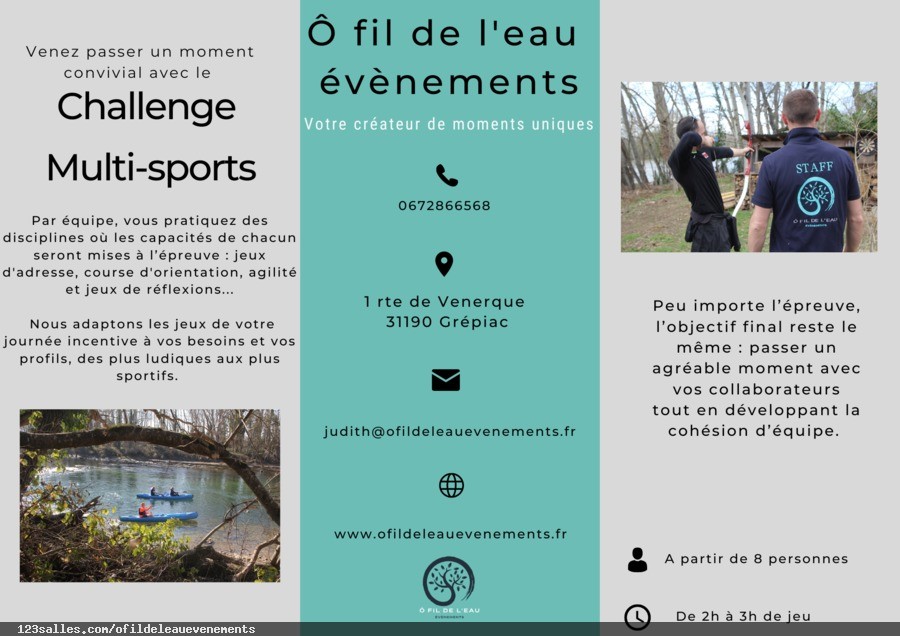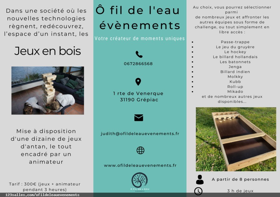 Ô fil de l'eau événements est un lieu de réception atypique, situé à Grépiac en bord d'Ariège. Nous proposons à la location des espaces insolites extérieurs (terrasse, cabane perchée, bulles...), une salle de séminaire intérieure 20/25 personnes et des activités de cohésion sur mesure en fonction de vos besoins.